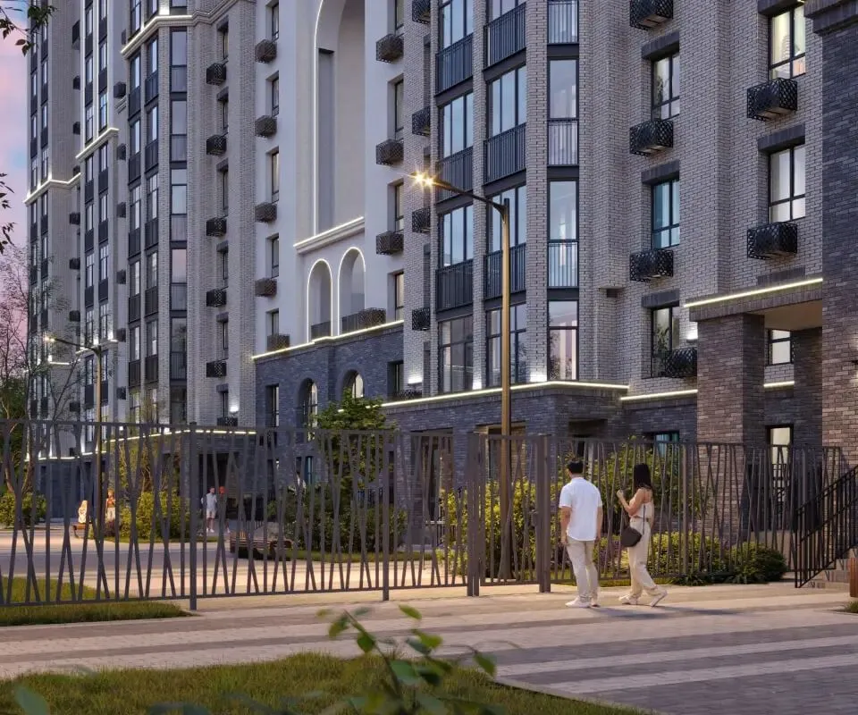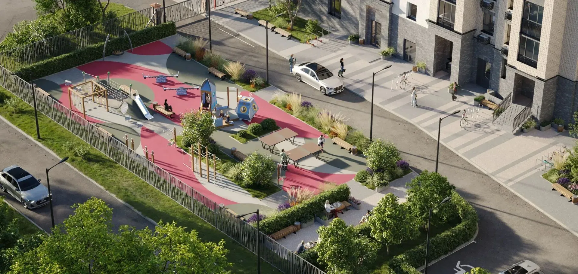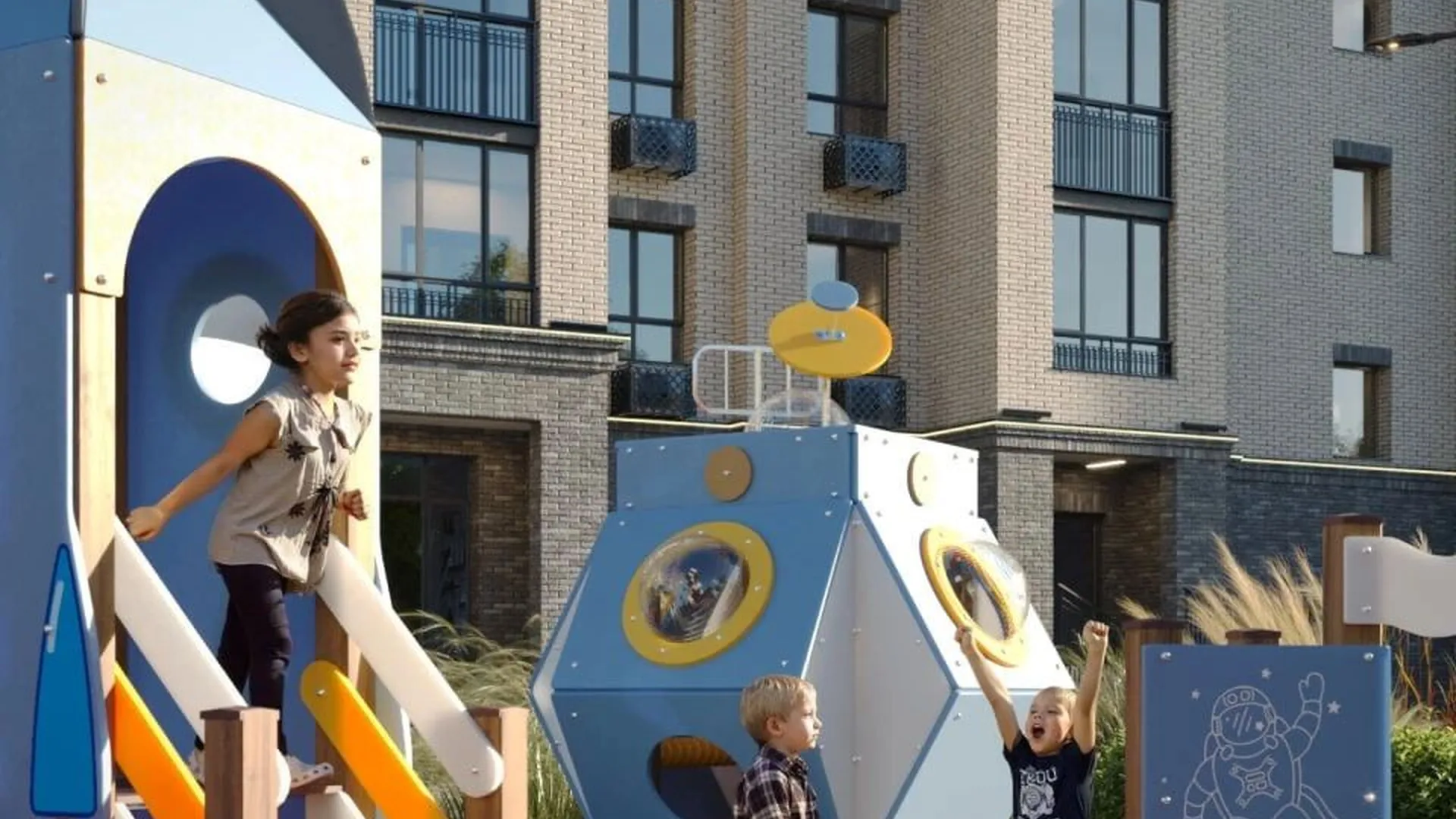 Дворовое пространство будет огорожено от проезжей части. На территории комплекса создадут игровую зону со столиками для шахмат, детскую площадку с арт-объектом в виде ракеты, спортивную площадку с тренажёрами, зону для йоги и настольного тенниса. Корпуса объединит ландшафтный сквер с прогулочным бульваром, цветниками и высокими деревьями.