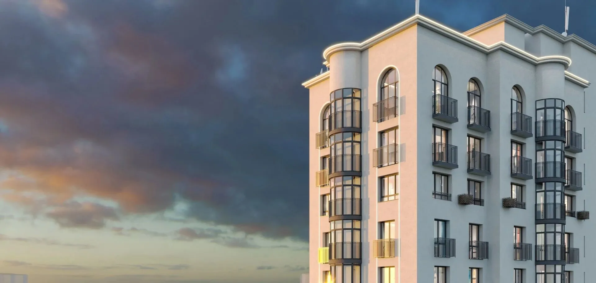 Комплекс состоит из двух монолитно-кирпичных корпусов высотой от 8 до 17 этажей. Всего в проекте 654 квартиры: студии, однокомнатные, двухкомнатные, трёхкомнатные и четырёхкомнатные. Высота потолков — от 2,77 до 3,67 м. Среди планировок — квартиры с окном в ванной, французскими балконами, арочными окнами, витражными эркерами, двухуровневые квартиры с террасами и квартиры с отдельным входом с улицы. Квартиры сдаются с чистовой отделкой или в состоянии white box (предчистовая отделка: белая гипсовая штукатурка, стяжка на полу, двухкамерные стеклопакеты, разводка электрики, металлическая входная дверь и установленные радиаторы).