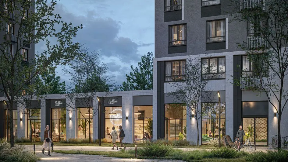 На первых этажах и между секциями предусмотрены галереи, в которых разместятся магазины, аптеки, ПВЗ, кофейни и другая коммерция.