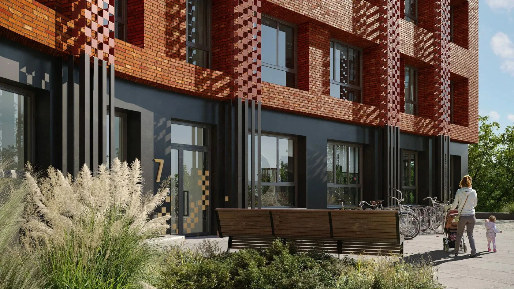 Для внешней отделки домов будут использованы материалы контрастных цветов и фактур: первый этаж будет оформлен крупноформатной плиткой графитового цвета, фасады нижних этажей — коричневым облицовочным кирпичом, верхних — белой штукатуркой.