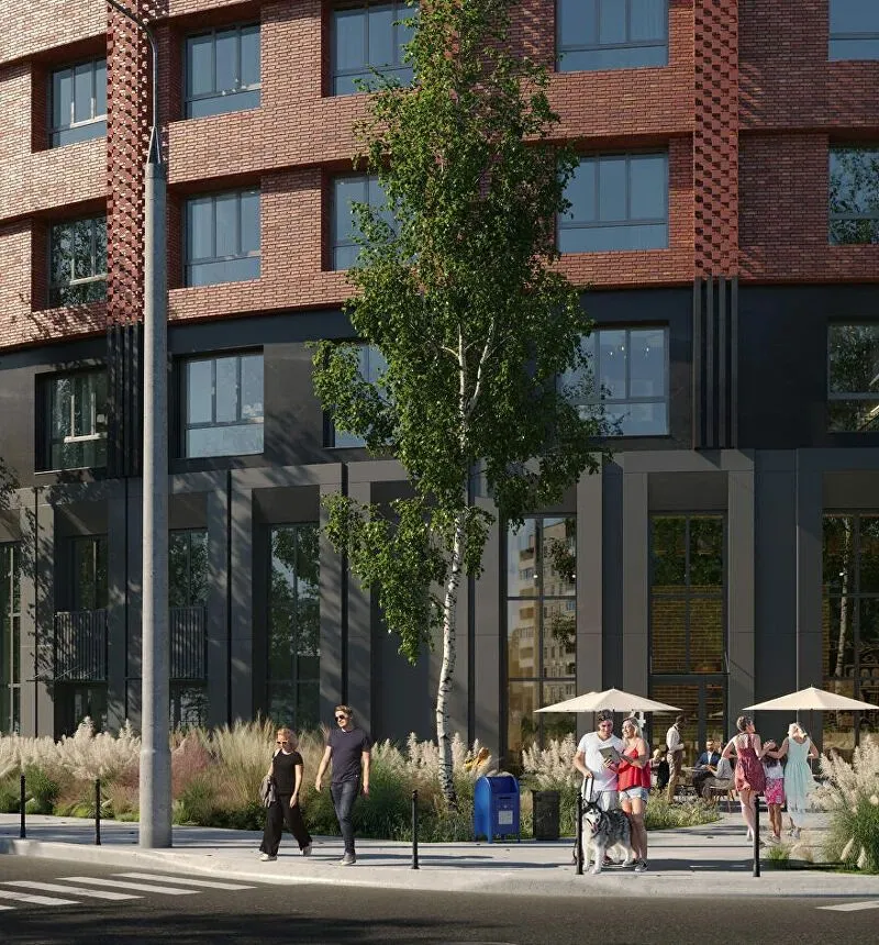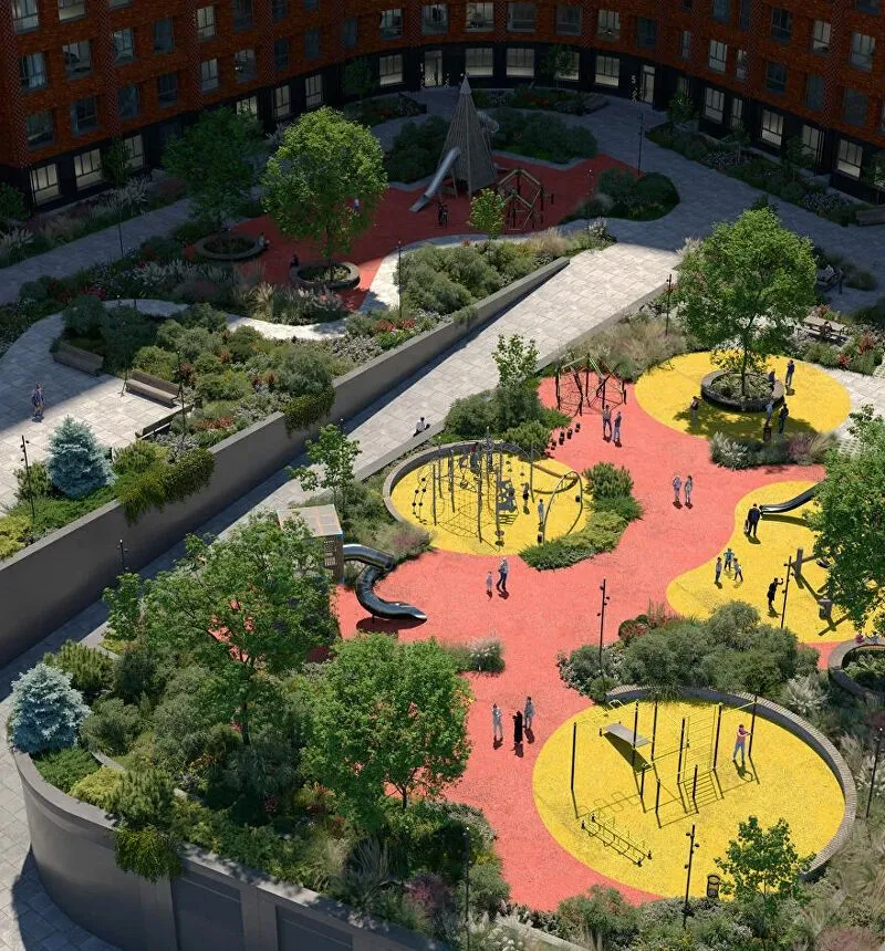 Территория комплекса будет огорожена забором. Во внутреннем дворе появятся зоны для спокойного отдыха в тени деревьев, детские площадки и места для занятий спортом на свежем воздухе.