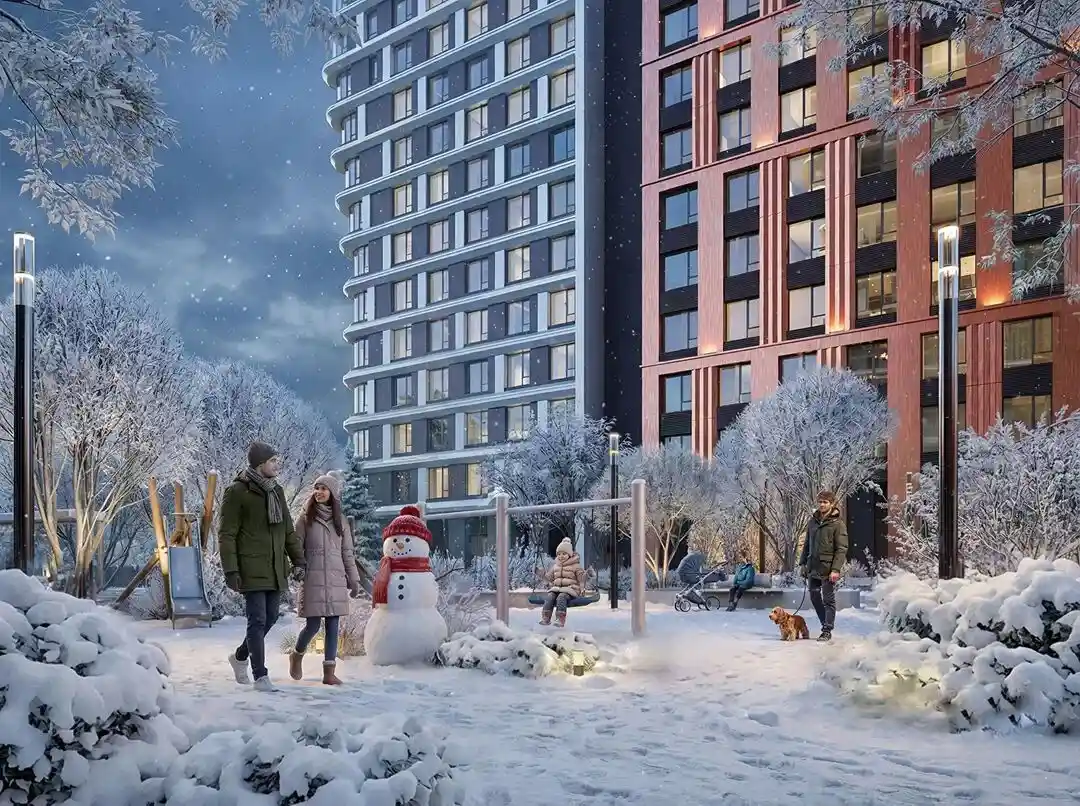 В каждой секции есть лобби с высокими потолками и дизайнерской отделкой. В интерьере применяются натуральные материалы природных оттенков. Особую атмосферу, в которой жители могут почувствовать спокойствие и безопасность, создает циркадное освещение.
