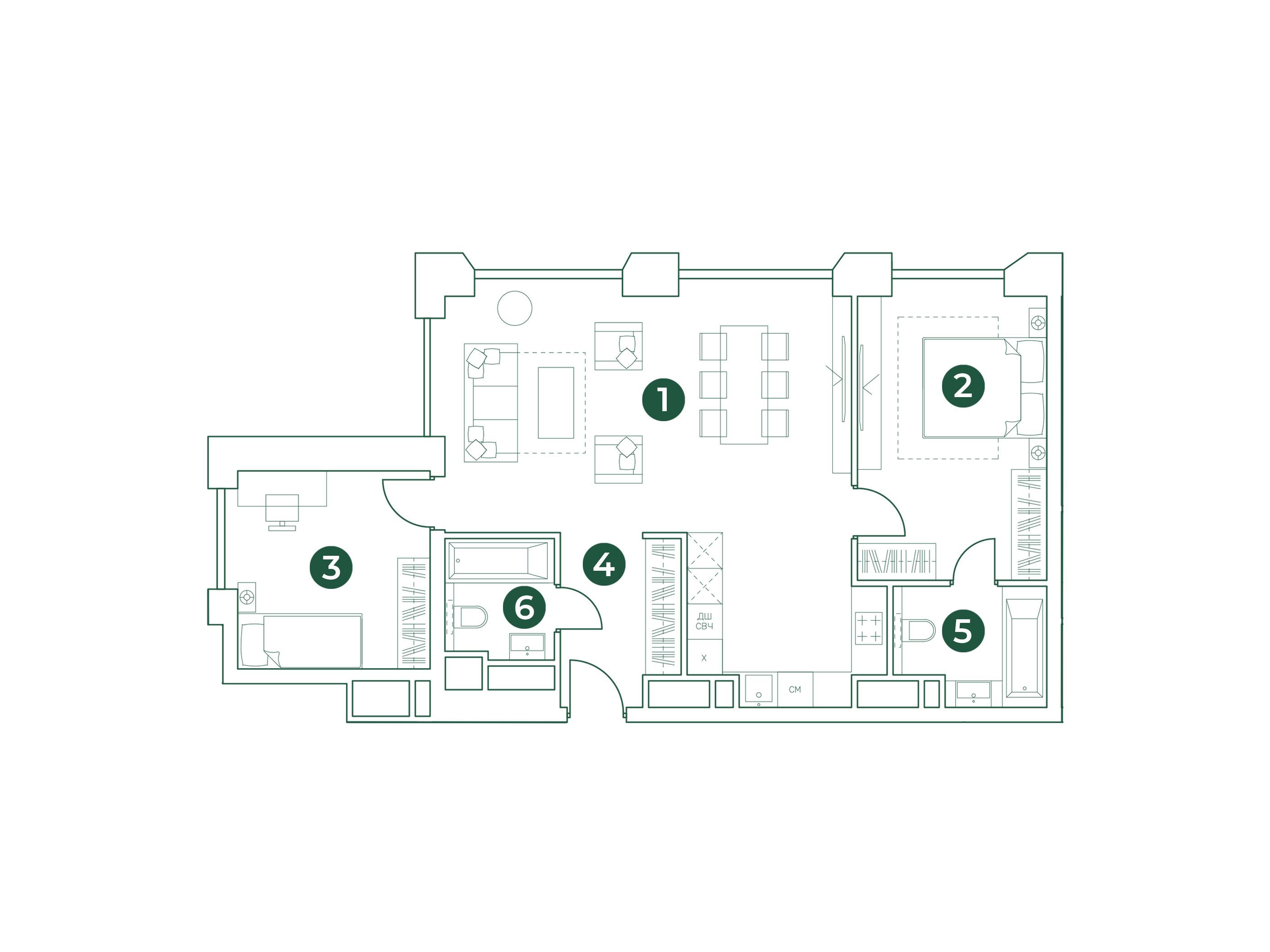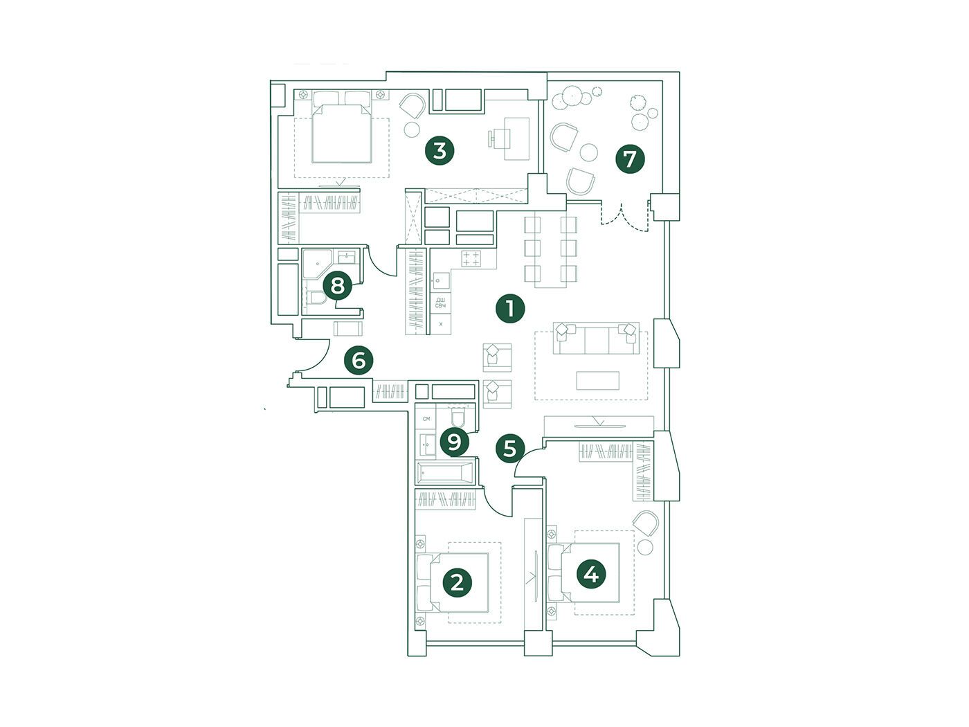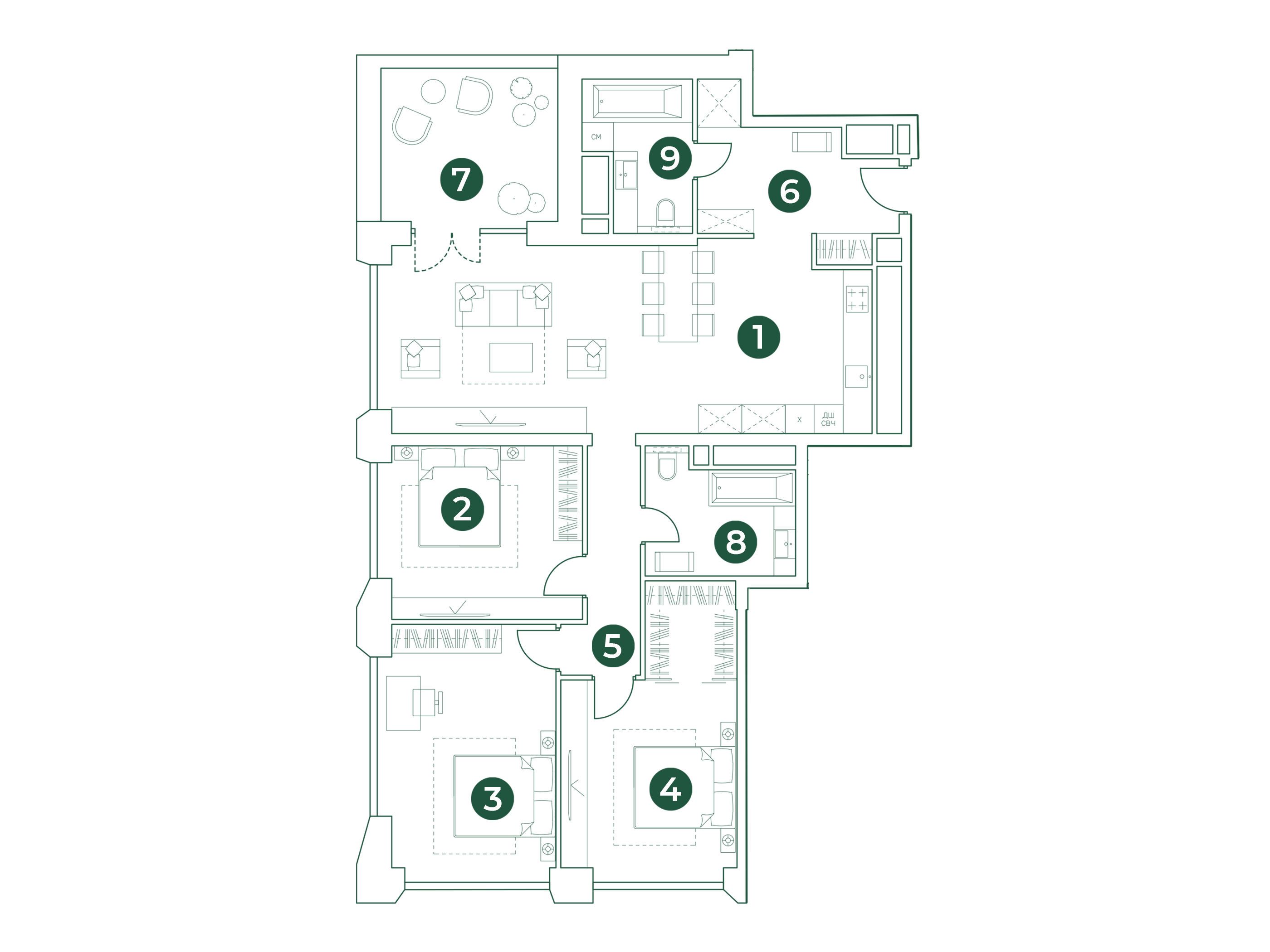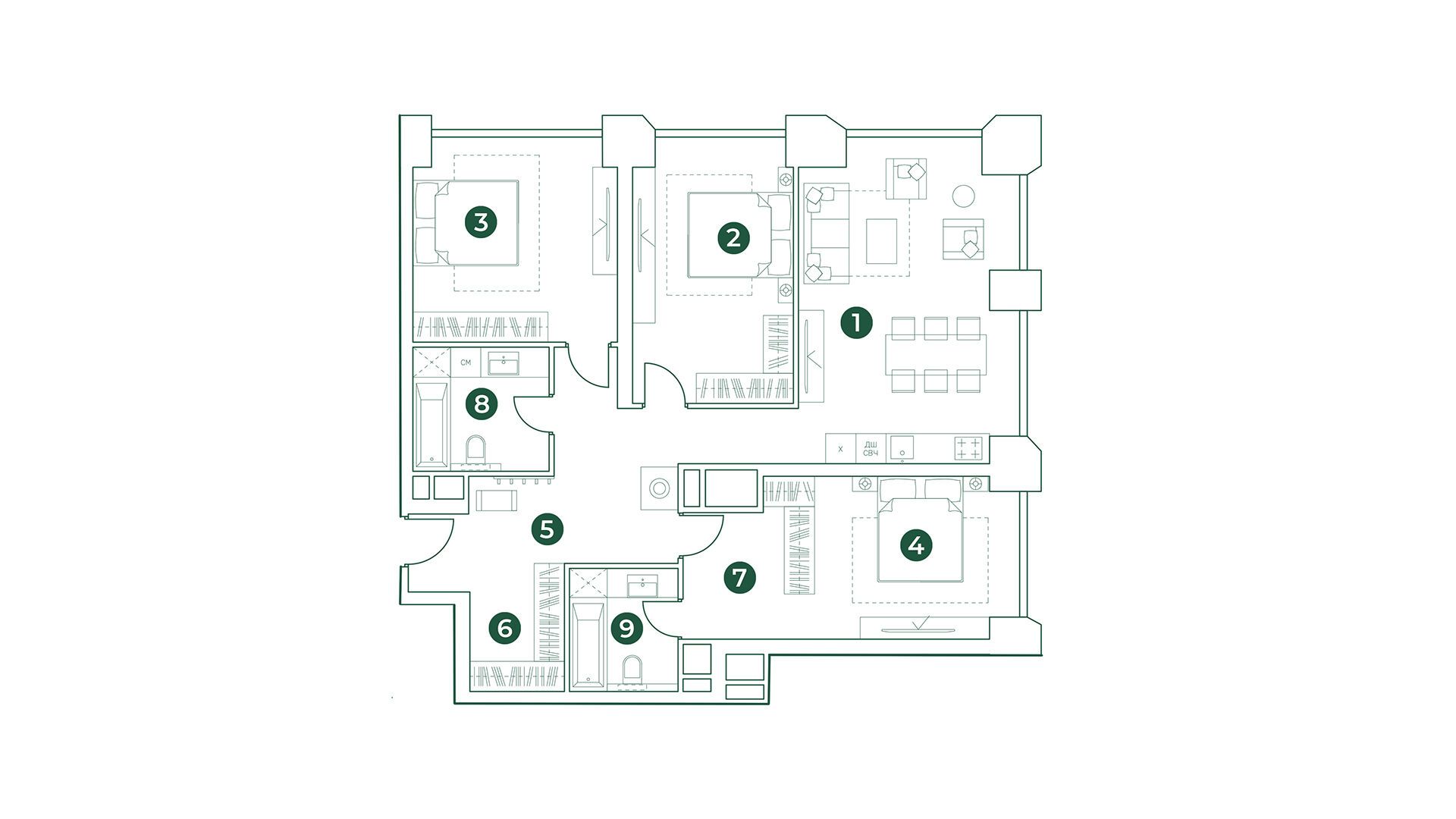Всего в квартале представлено 1456 квартир, включая как традиционные планировки, так и уникальные форматы. Здесь можно найти студии, одно-, двух-, трех- и четырехкомнатные квартиры, а также лоты повышенной комфортности с террасами. Площадь квартир варьируется от 23 до 113 квадратных метров, а высота потолков составляет от 2.8 до 3.2 метров.