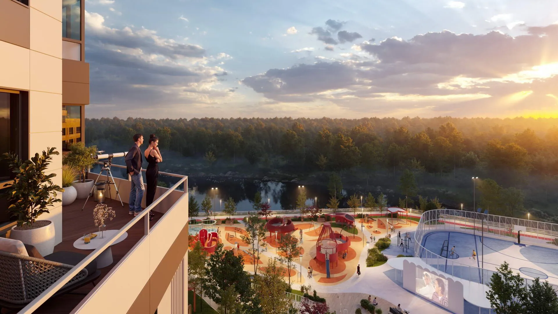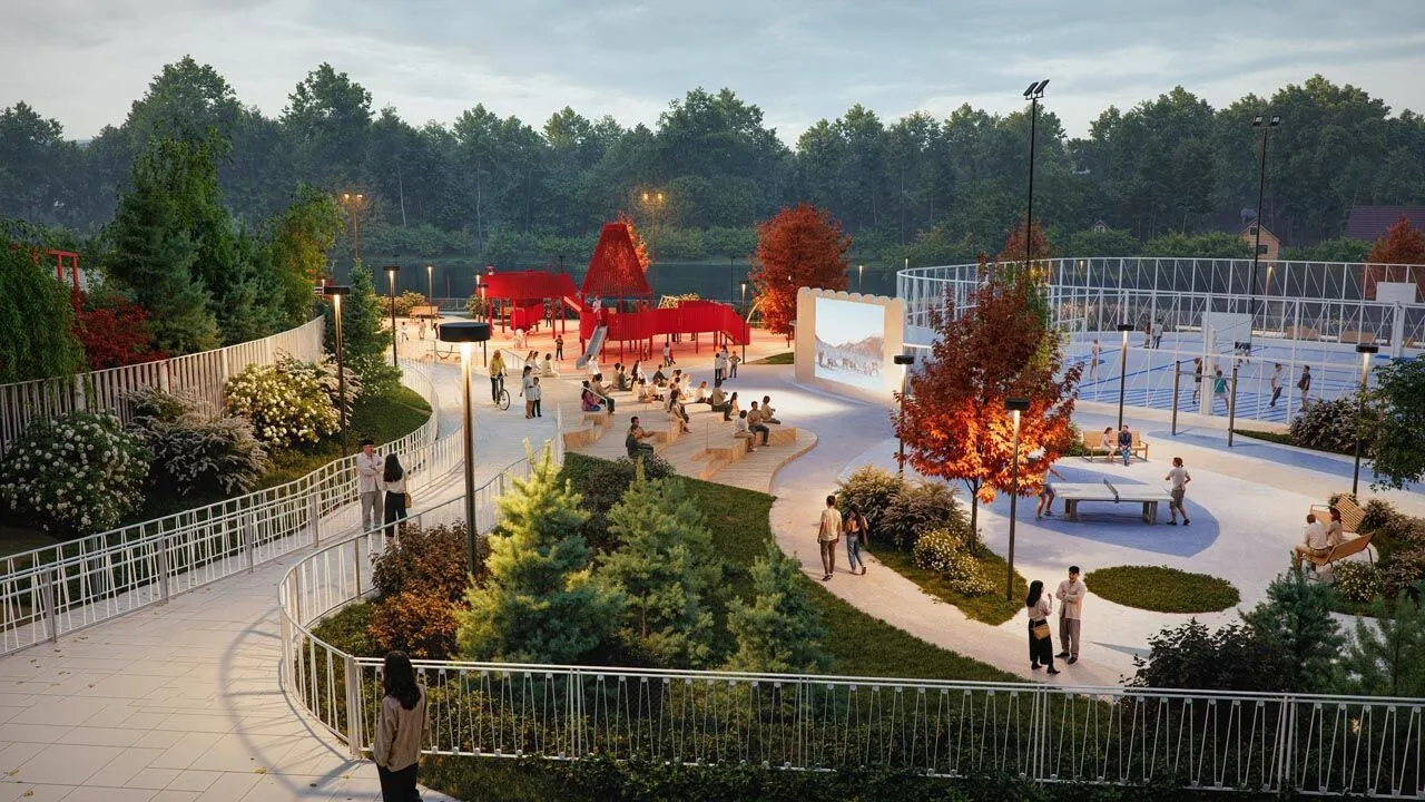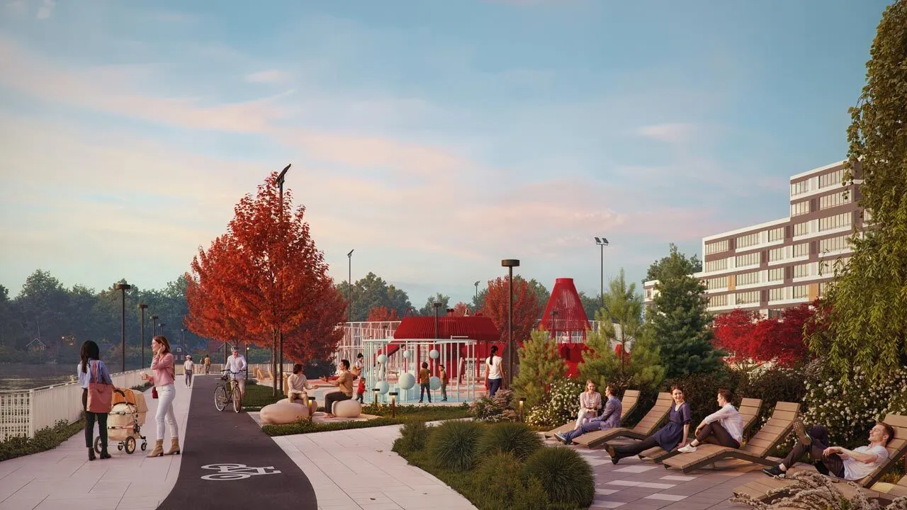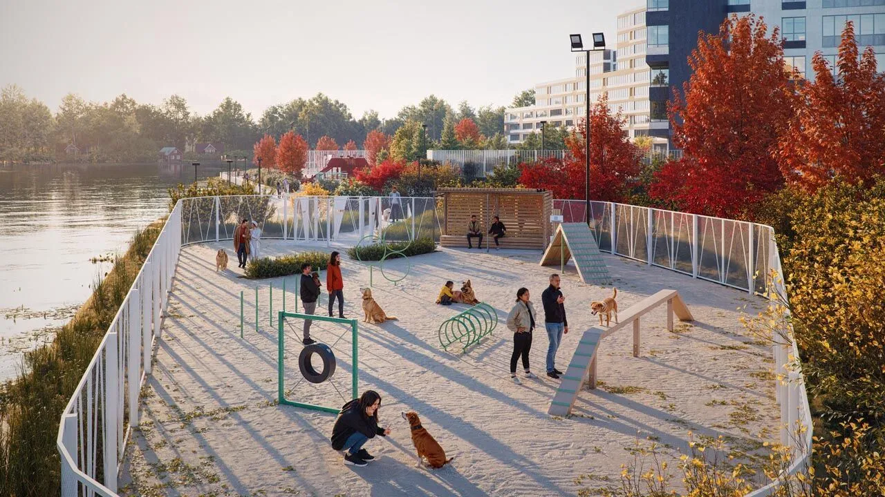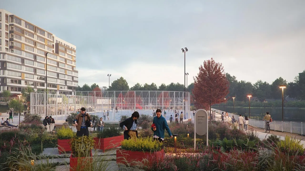 Благоустройство ориентировано на комфортный семейный отдых. На территории запроектированы: зоны отдыха для детей и взрослых, набережная с плейхабом, спортивный кластер, сеть прогулочных и велосипедных дорожек, амфитеатр для мероприятий и летних киновечеров, общественный огород, а также специальные площадки для выгула собак с навесами и тренажёрами. Двор частично ограждён, действует контроль доступа для обеспечения безопасности жильцов.