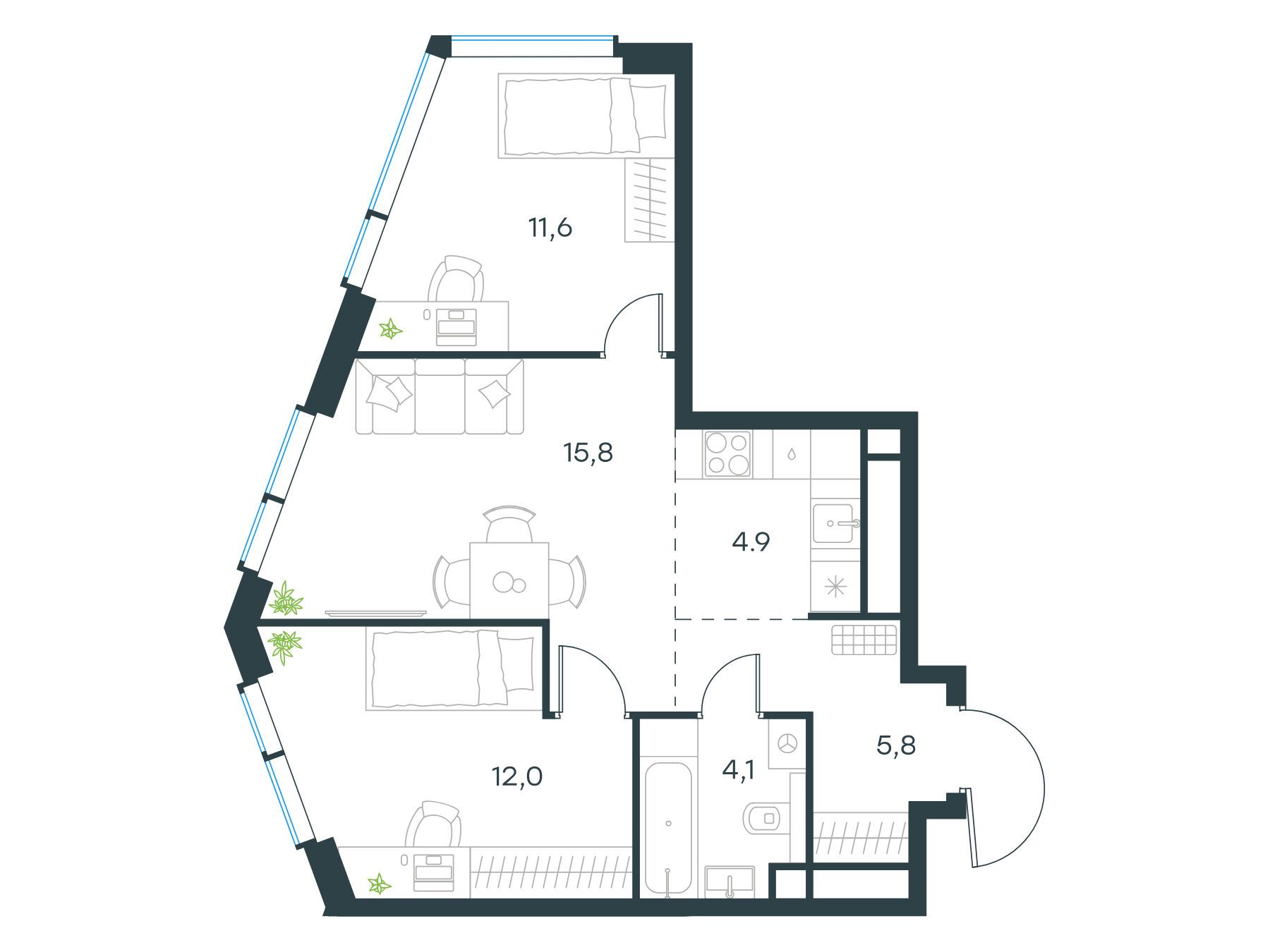 3-комнатная квартира, 56.40 м², 46 из 48 эт.
