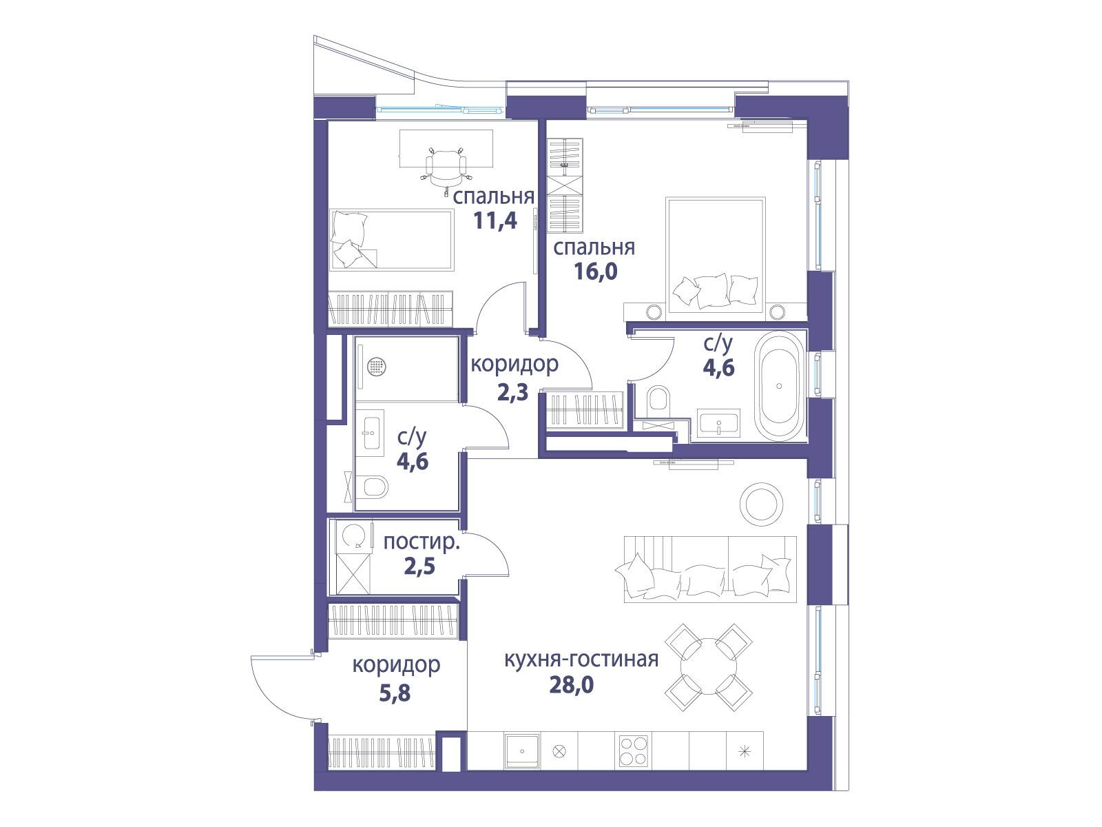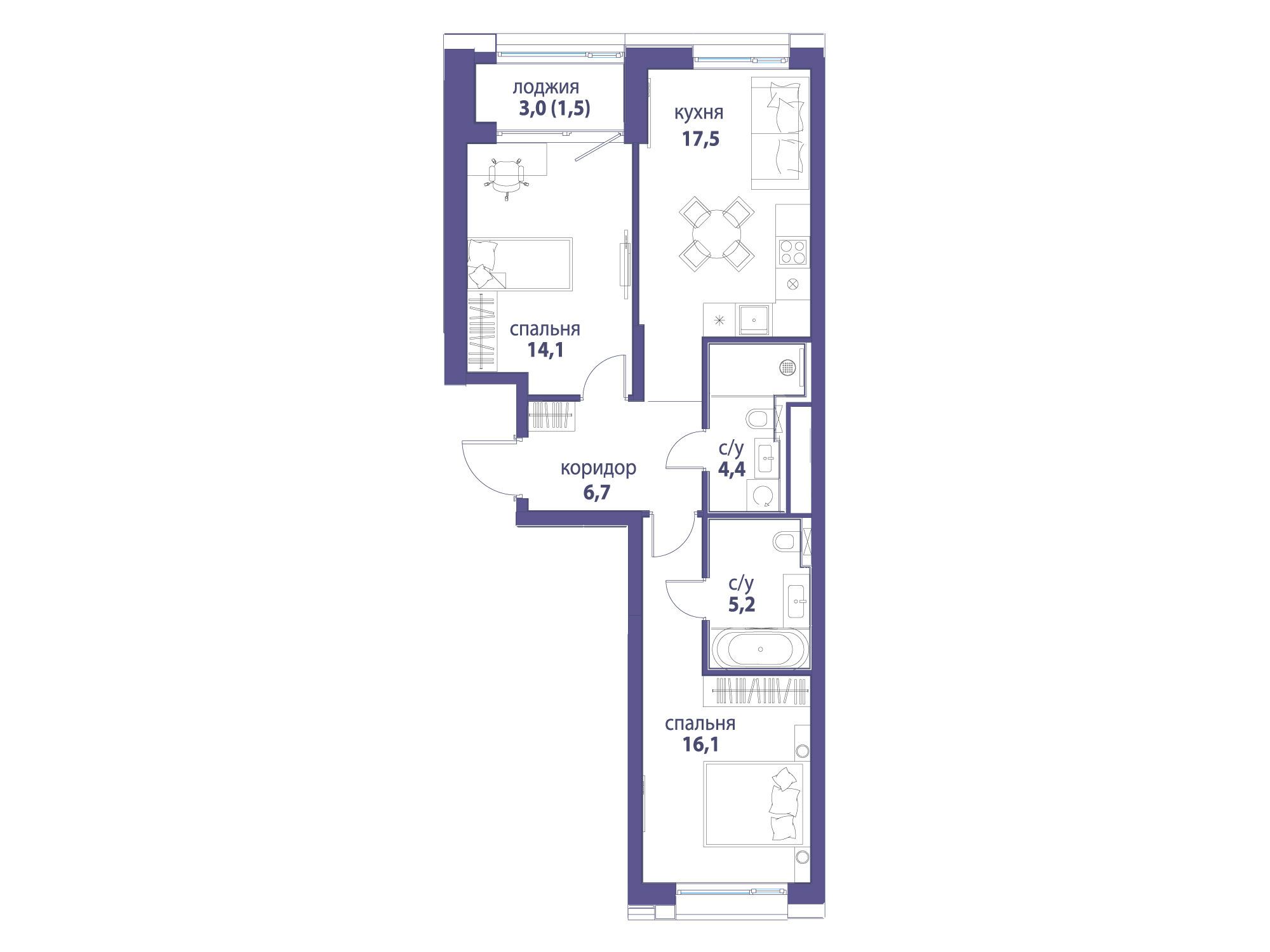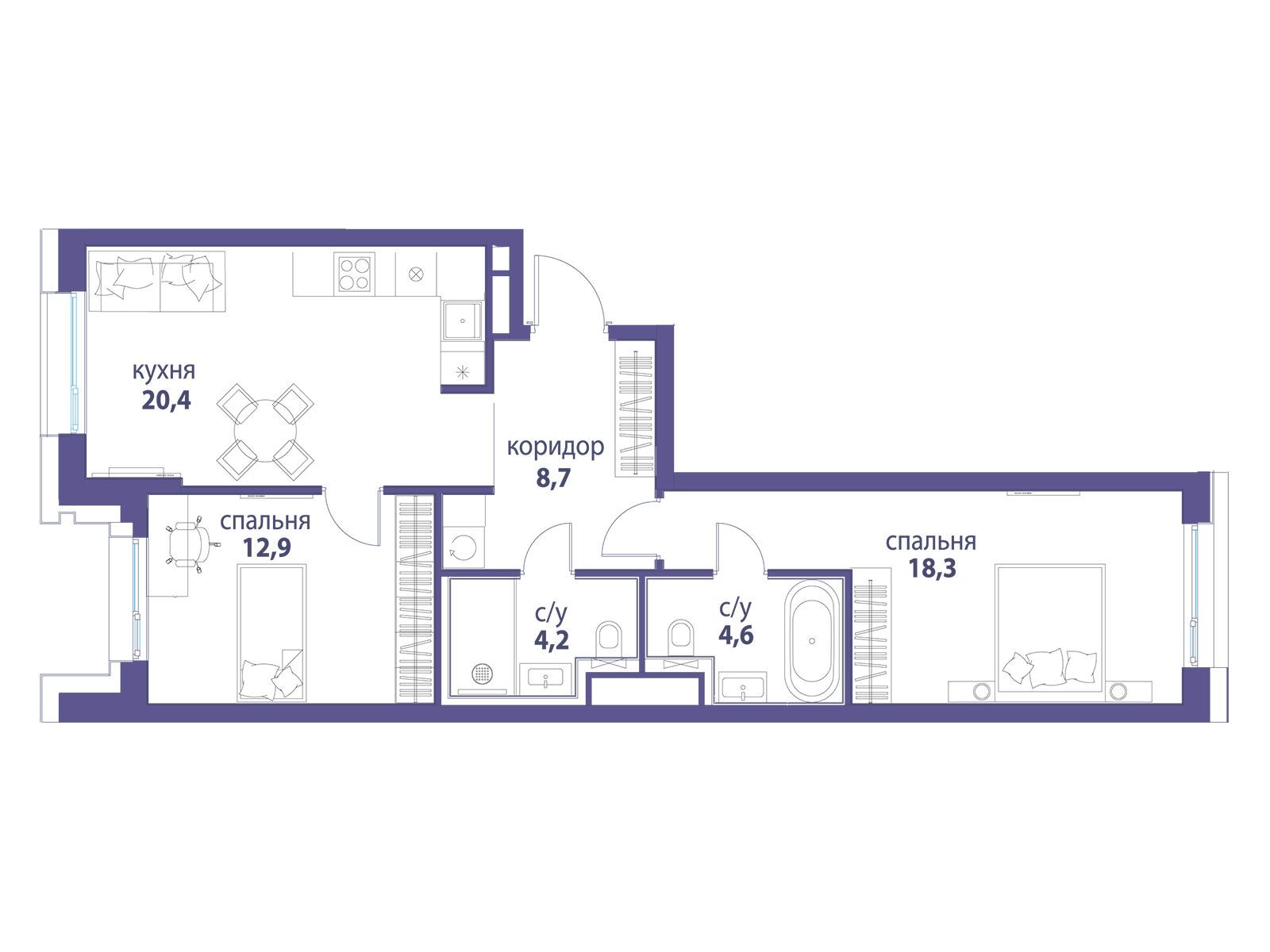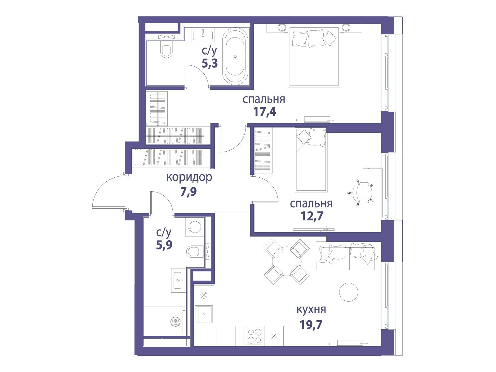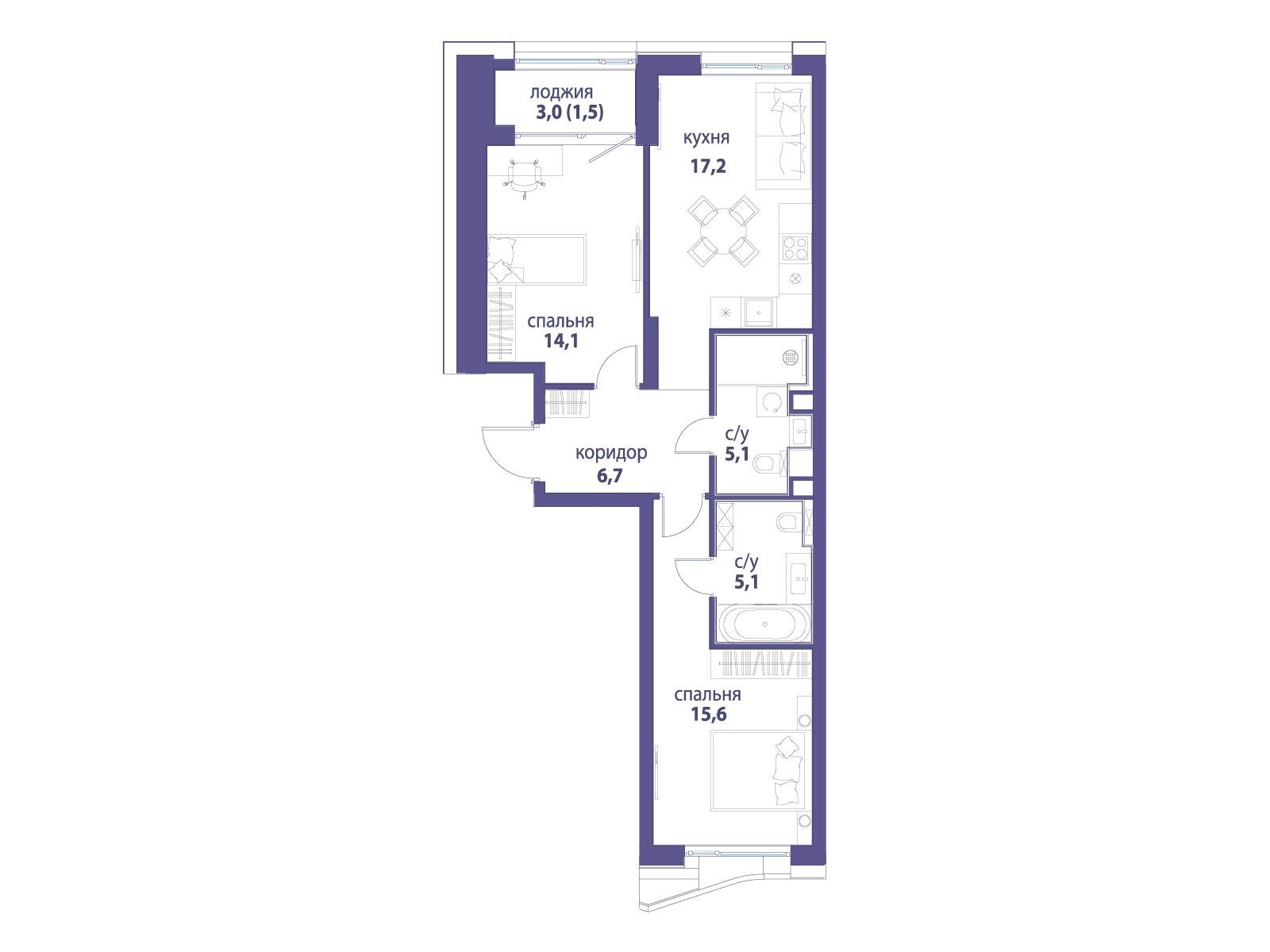 2-комнатная квартира, 55.50 м², 22 из 25 эт.