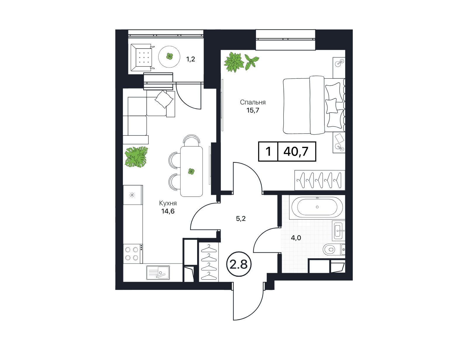 1-комнатная, 42.10 м²