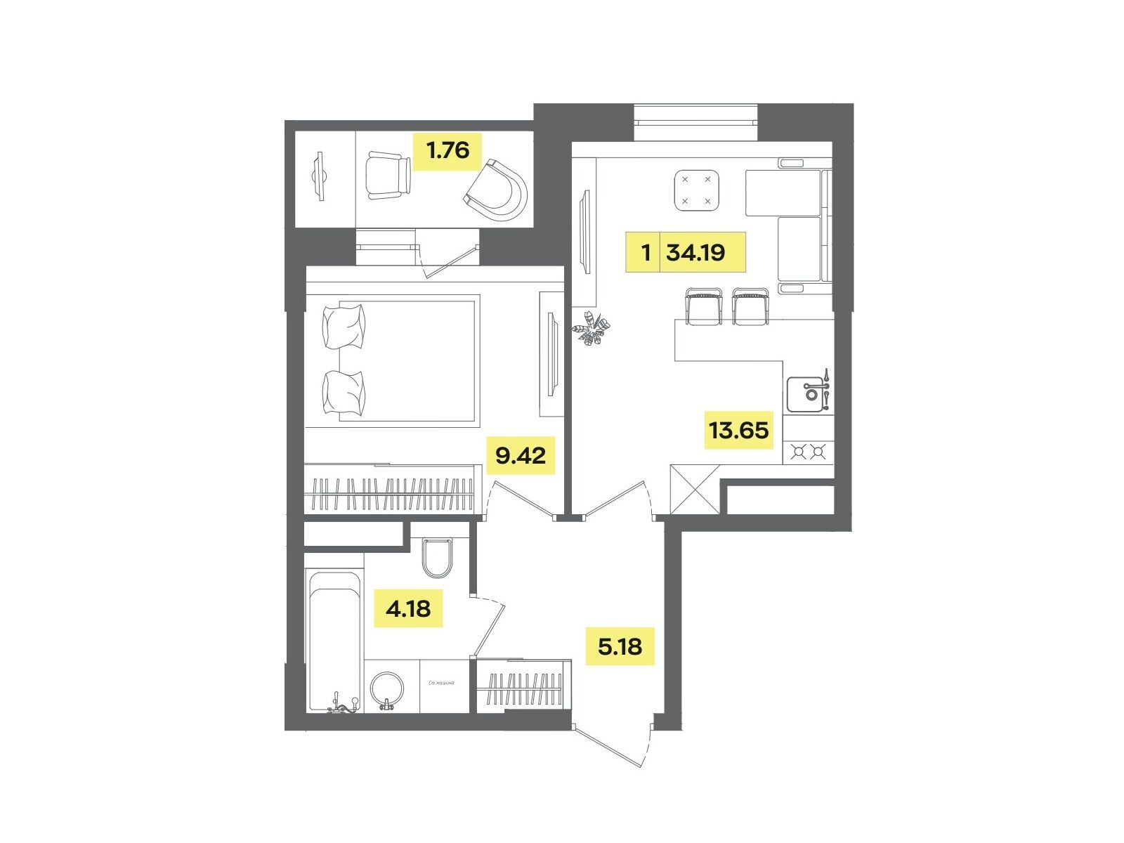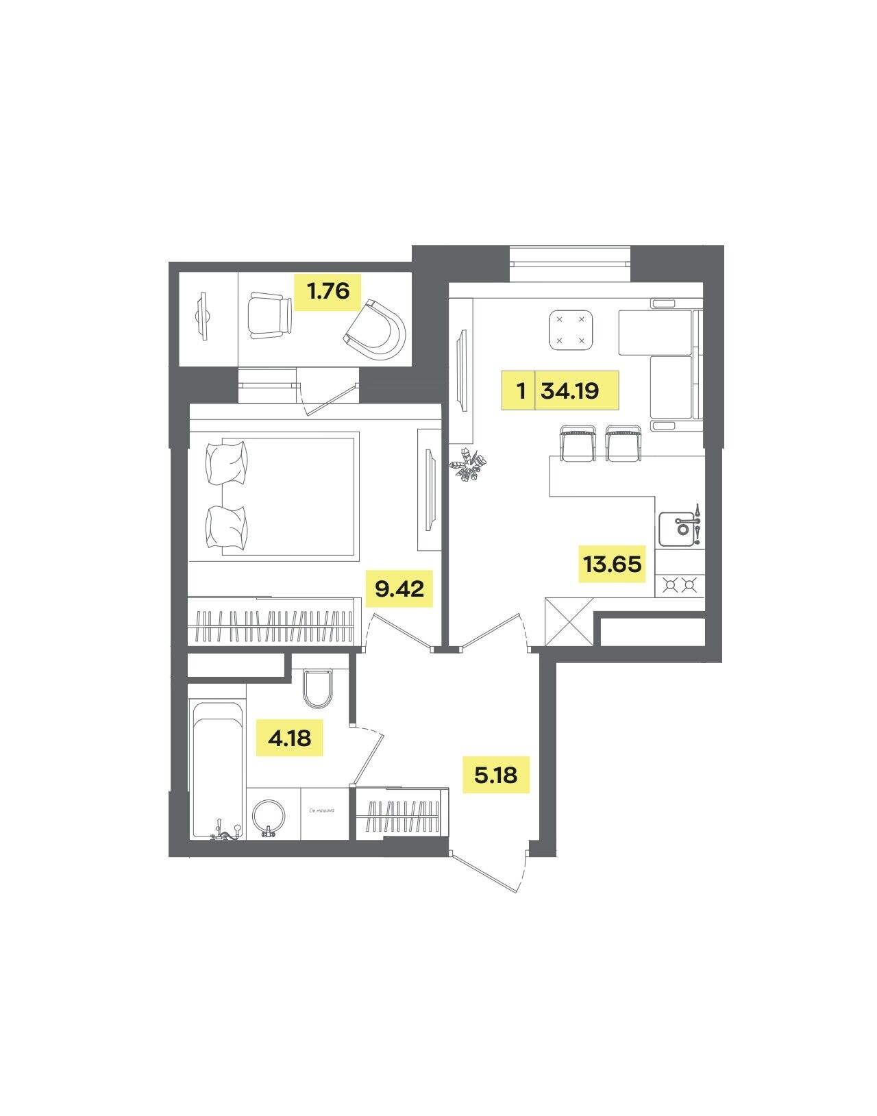 2-комнатная, 35.23 м²