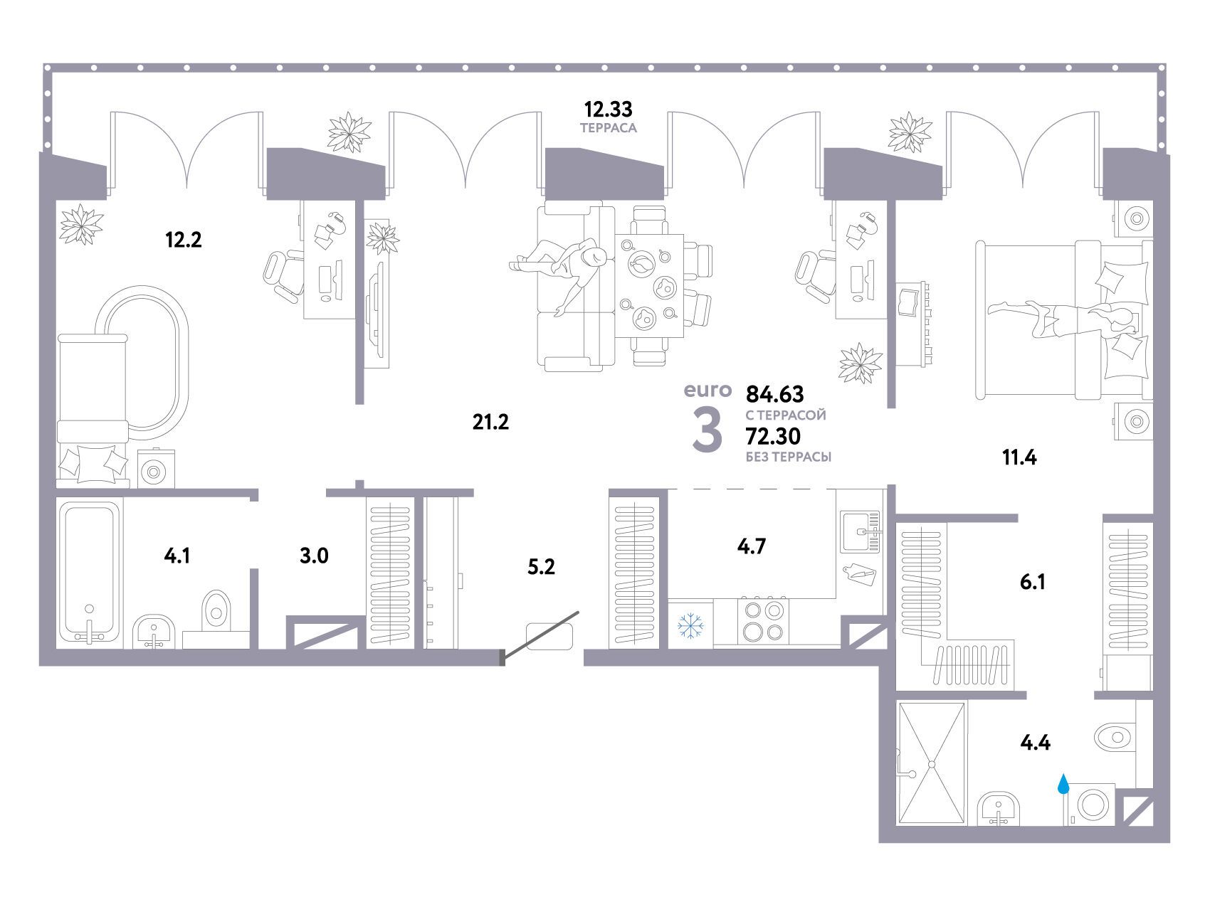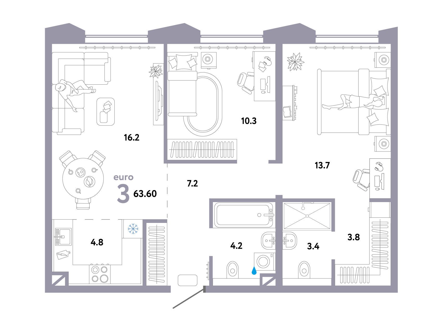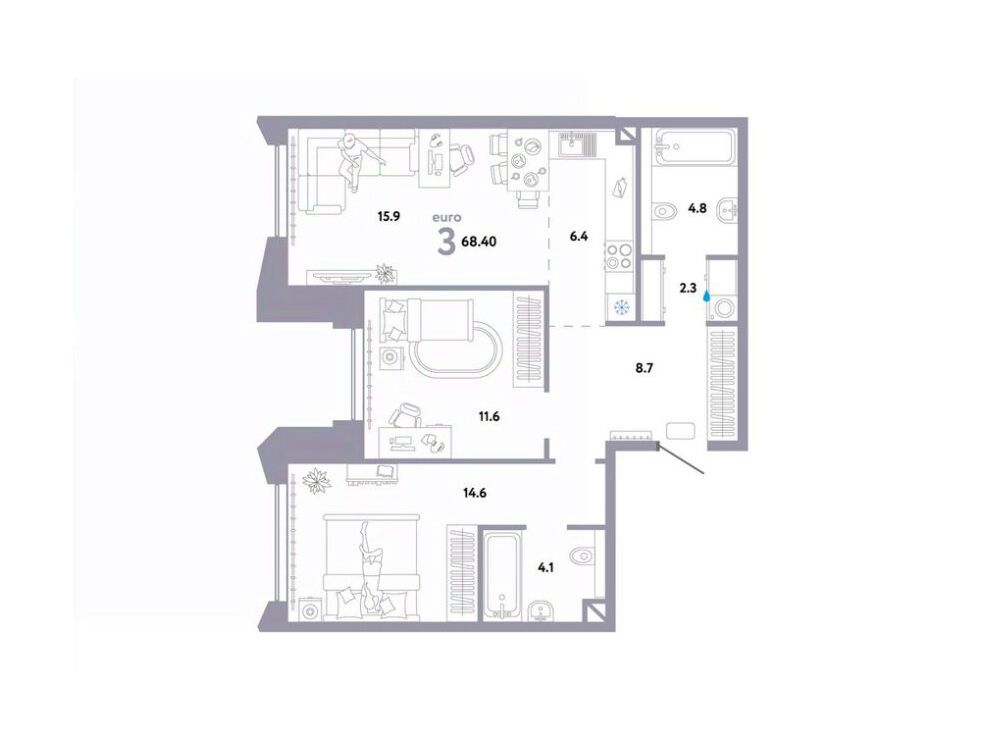 3-комнатная квартира, 68.60 м², 8 из 30 эт.