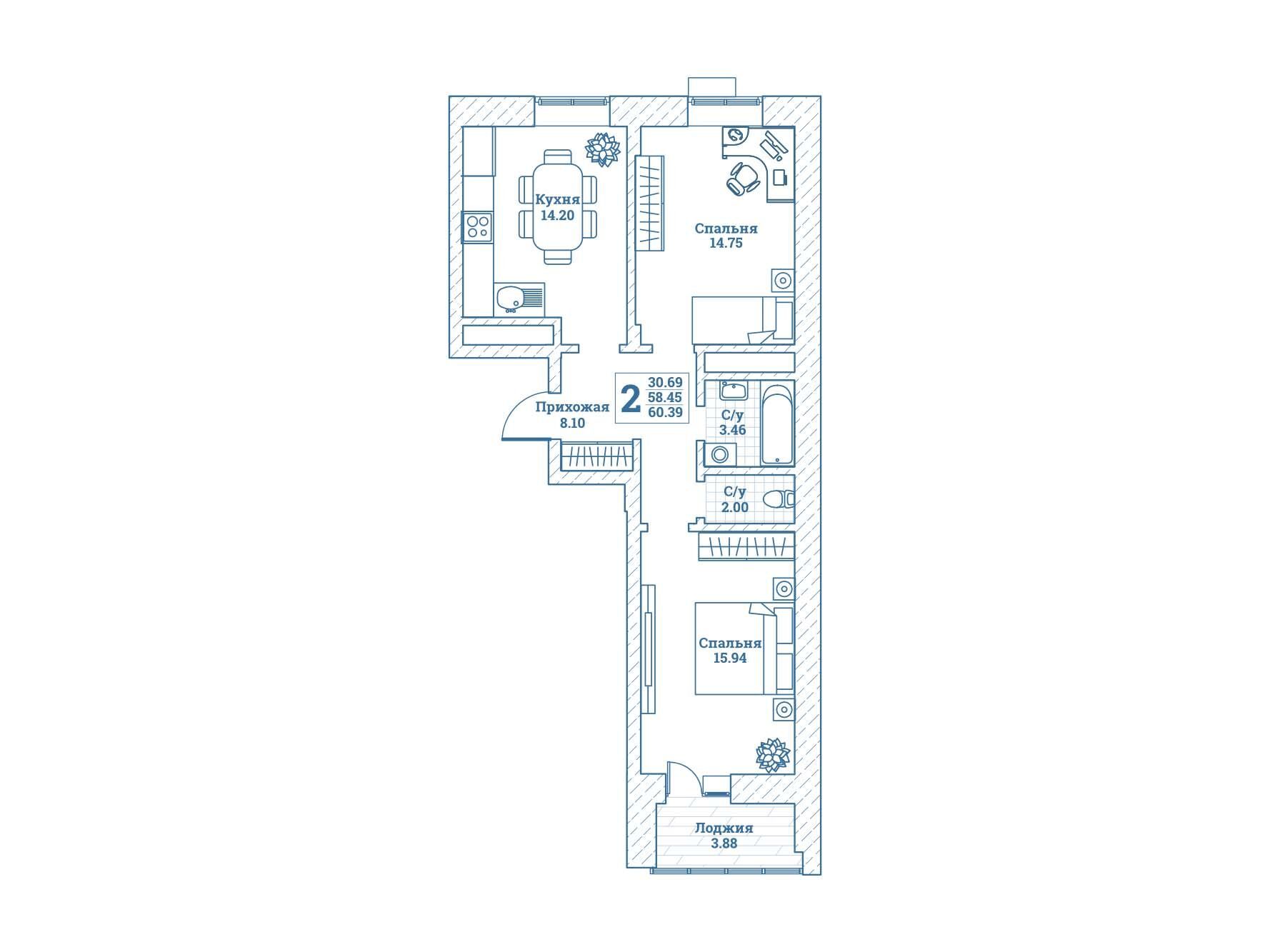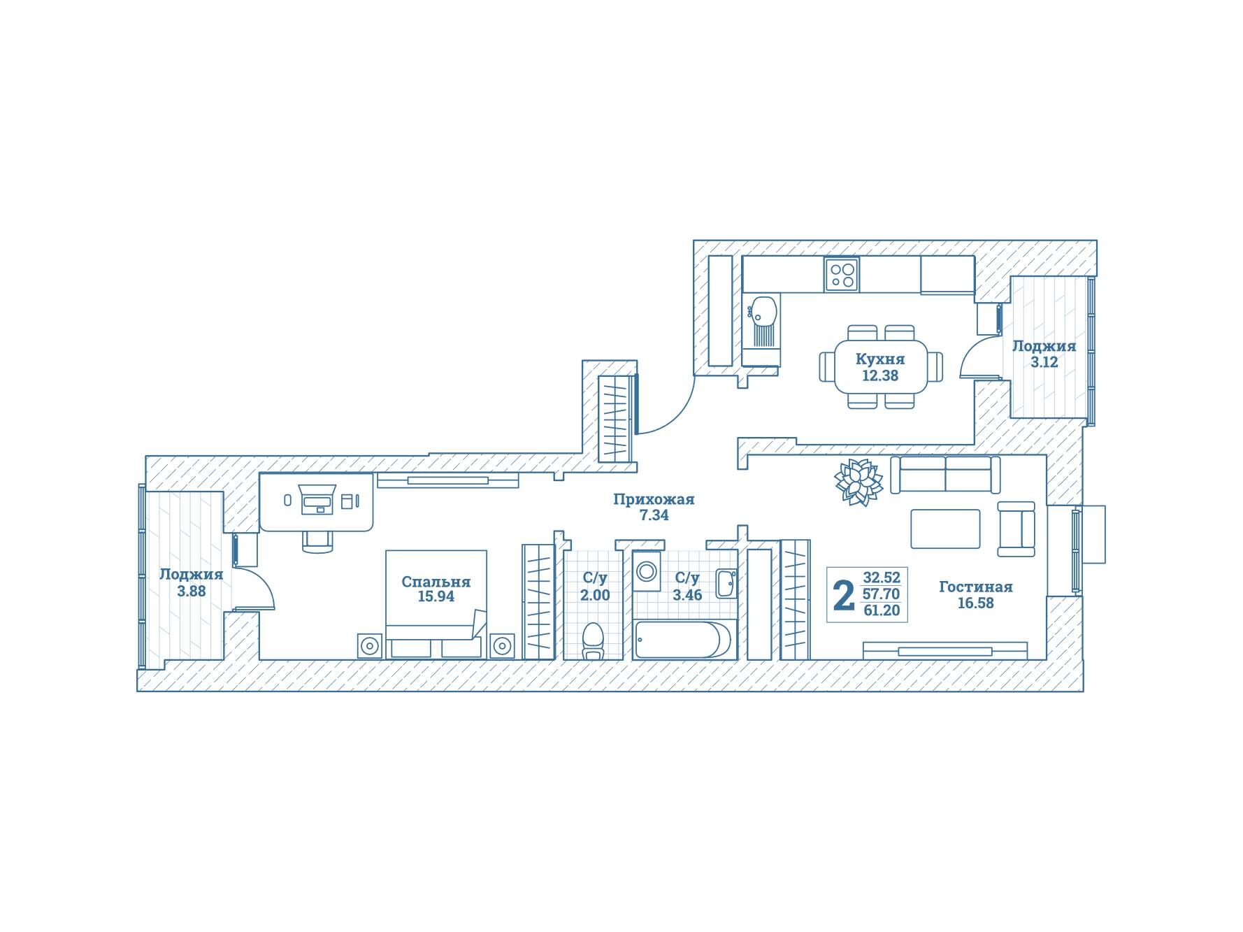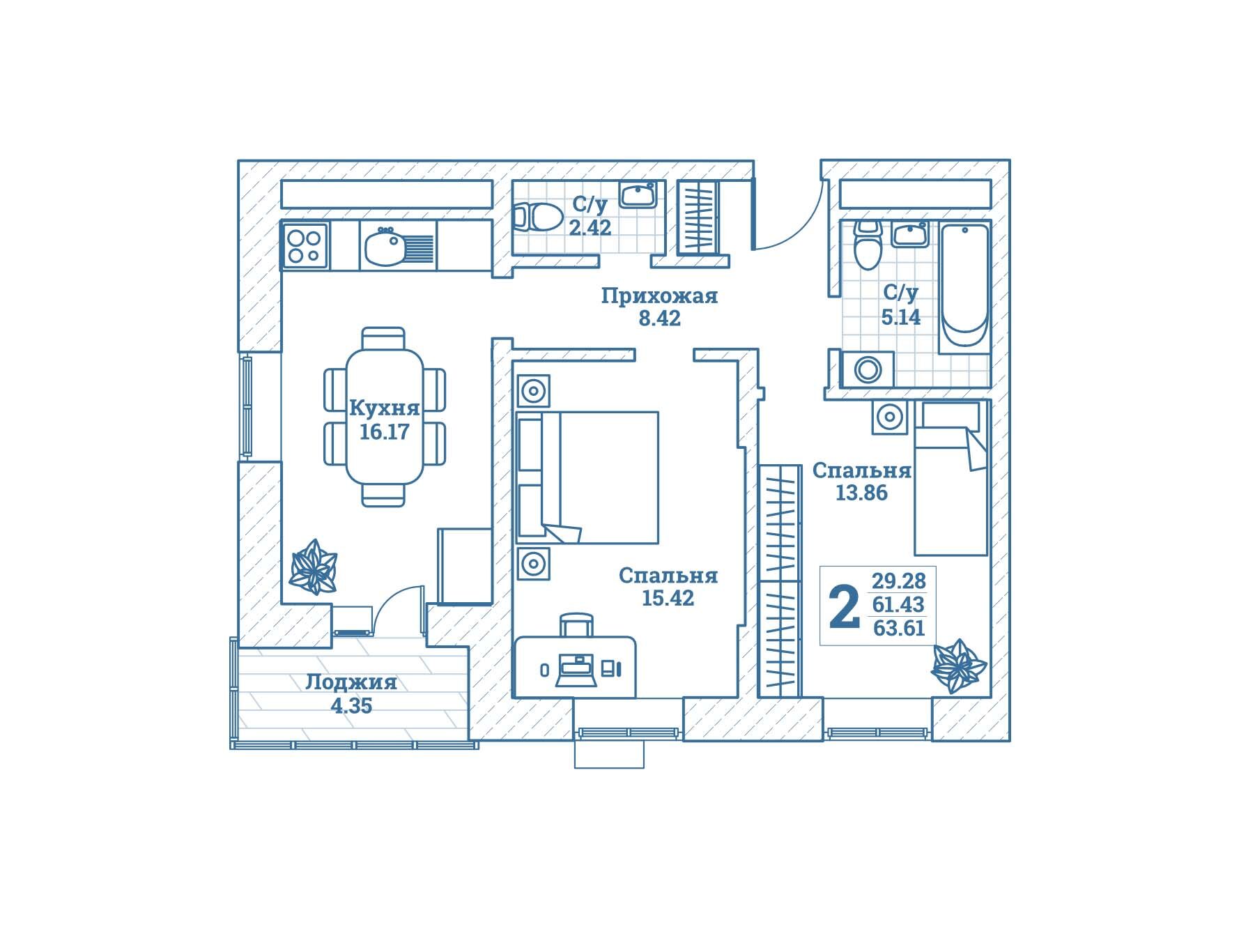 2-комнатная квартира, 61.20 м², 1 из 7 эт.