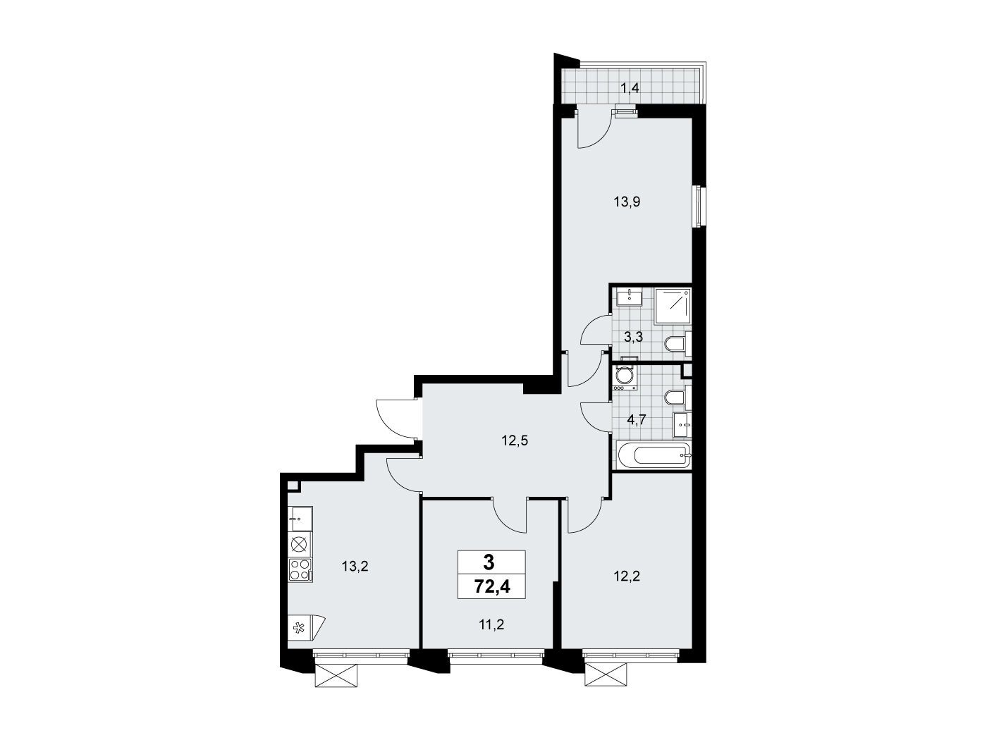 3-комнатная, 74.90 м²