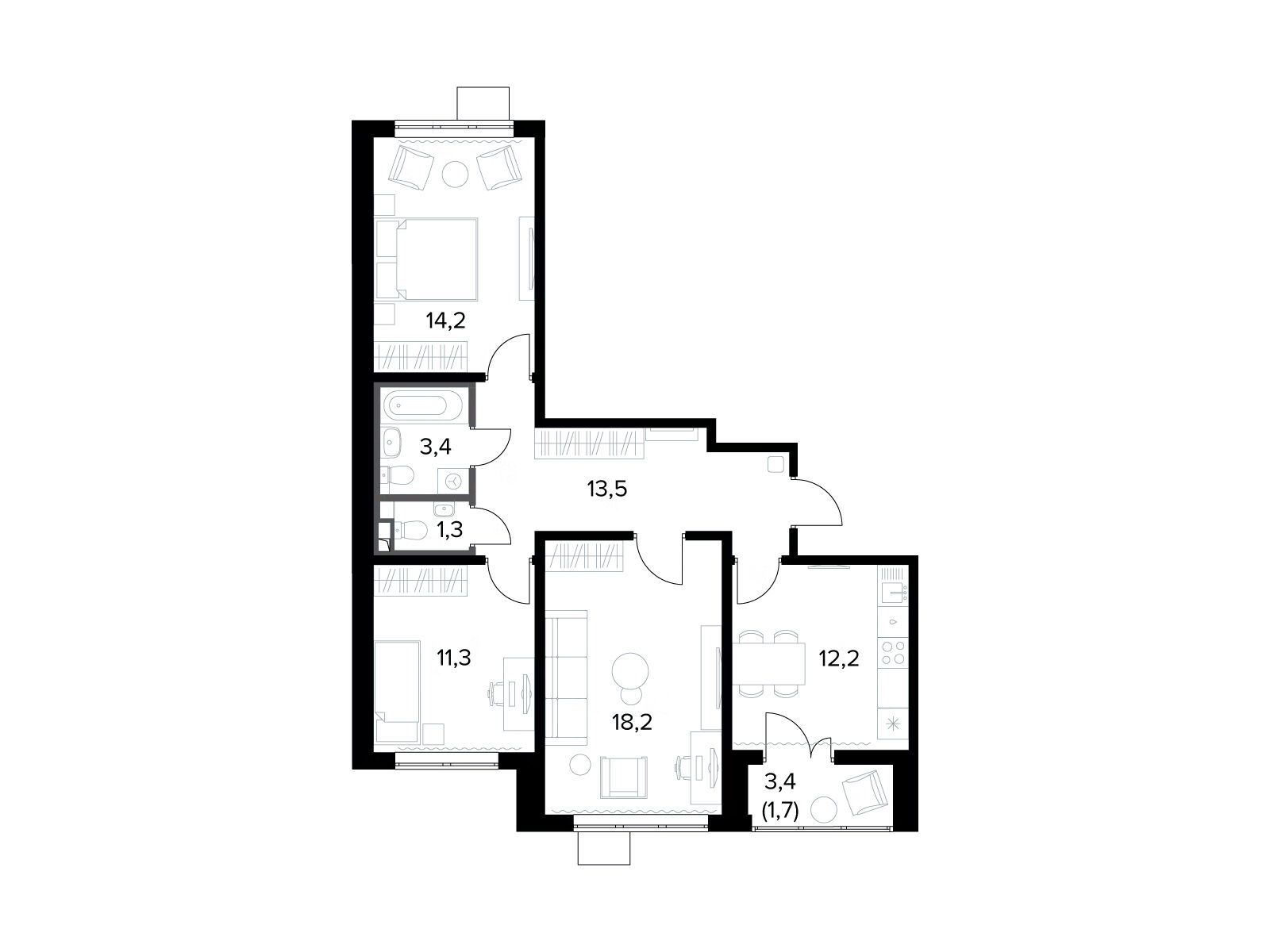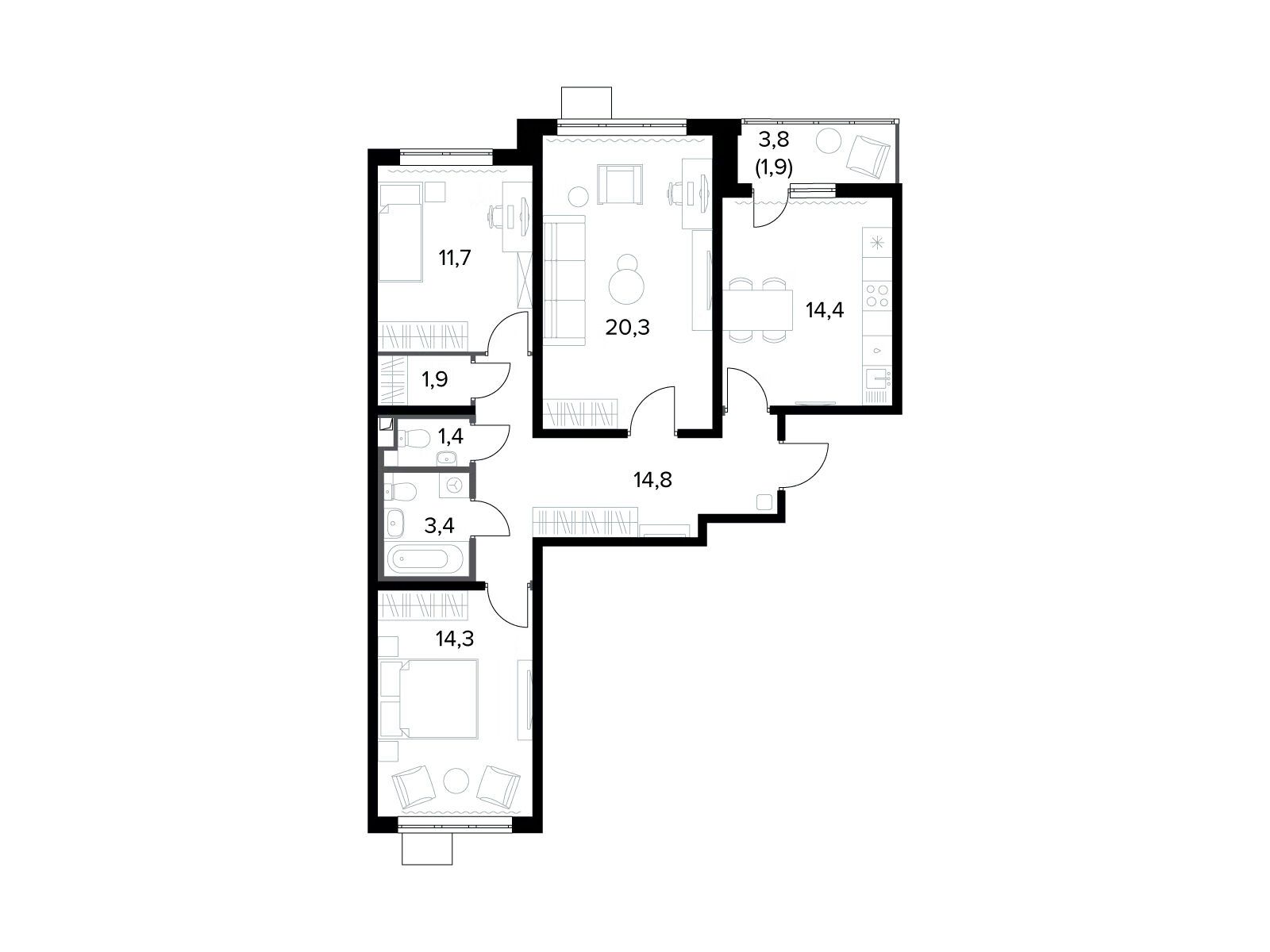 3-комнатная квартира, 77.90 м², 20 из 21 эт.