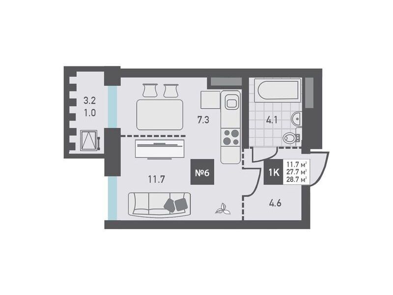 Студия, 28.70 м²
