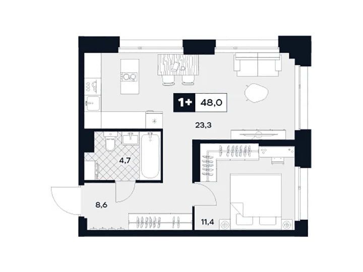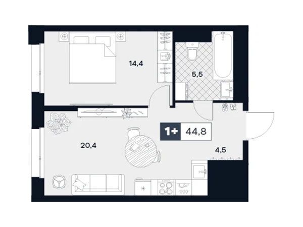 1-комнатная, 43.10 м²