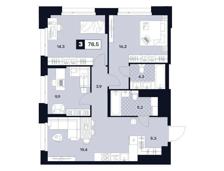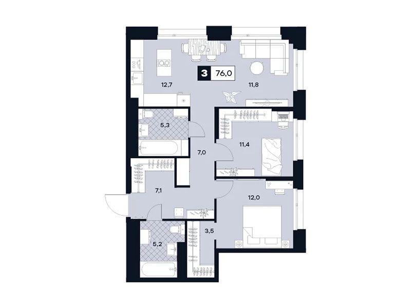 3-комнатная квартира, 76.00 м², 15 из 25 эт.